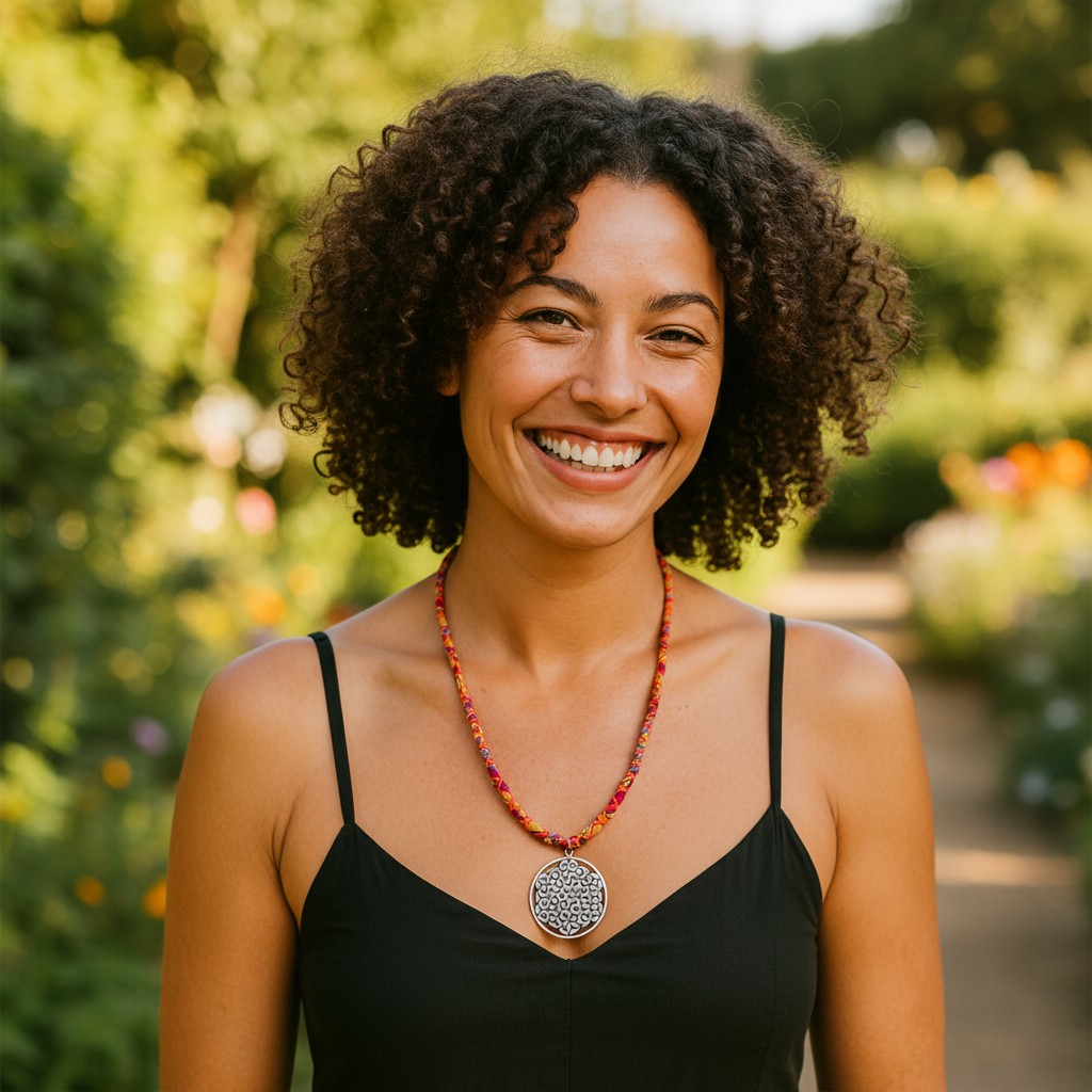 El yapımı bu kolye, yaşam çiçeği sembolüyle enerjiyi ve dengeyi temsil eder. Renkli kumaş örgüsüyle bohem tarzı modern bir dokunuşla buluşturur. Günlük kullanıma uygun hafiflikte, sürdürülebilir malzemelerle üretilmiştir.