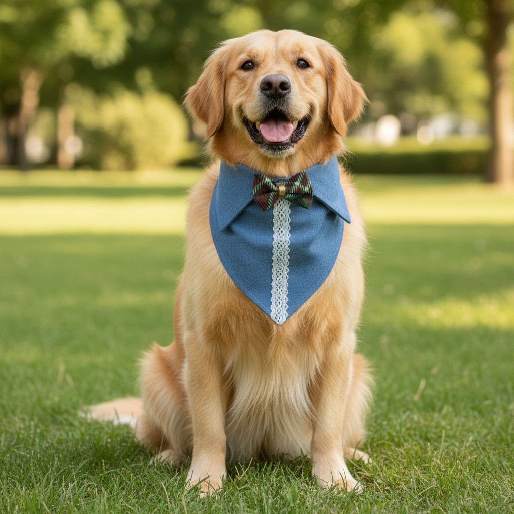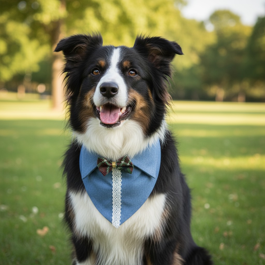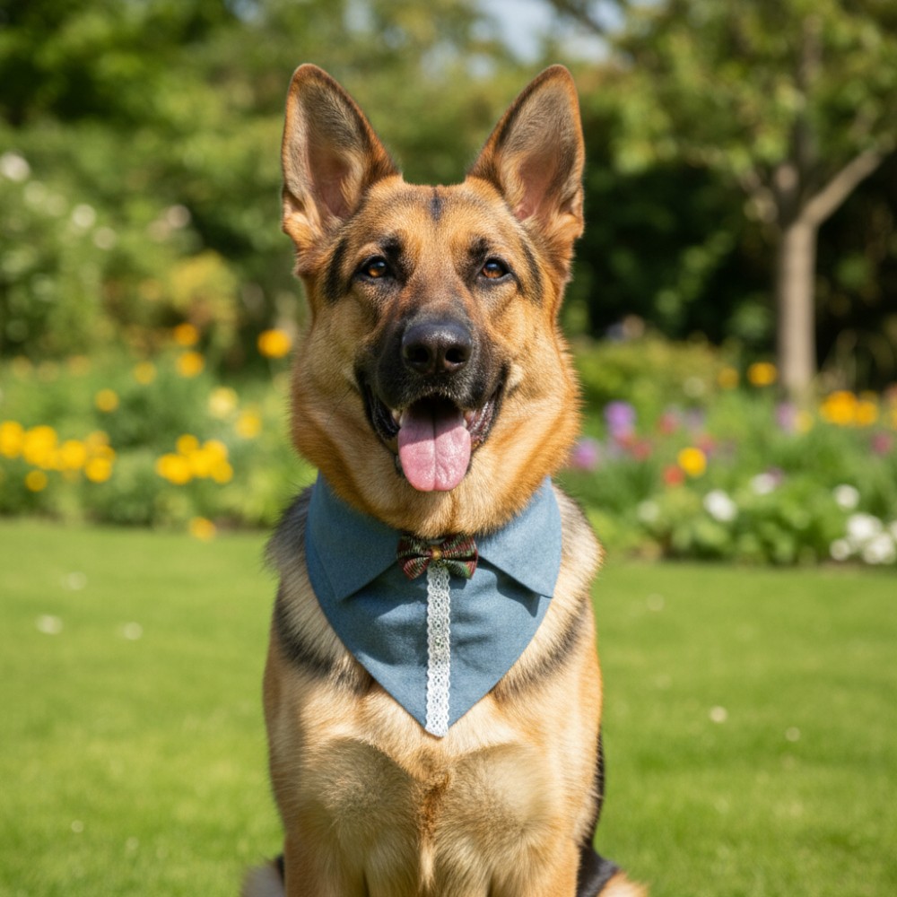 Dantelli Dokunuş modeli, açık mavi denim kumaşın sade şıklığını beyaz dantel şeridi ve kırmızı-yeşil desenli fiyonk detayıyla buluşturur. El yapımı olarak tasarlanan bu pet yaka, klasik zarafeti ve günlük konforu bir arada sunar. 40–48 cm boyun ölçüsüne uygun ayarlanabilir kapama sistemi sayesinde, büyük ve orta ırklar için ideal bir kullanım sağlar.