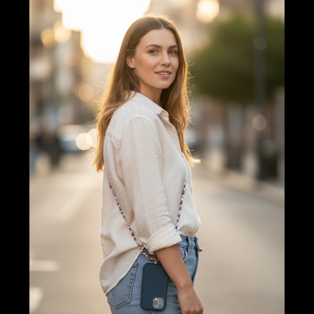 FEDD Jewelry’nin zarif beyaz çiçekli kumaş telefon askısı, sade dokusu ve romantik renk paletiyle günlük şıklığı yeniden tanımlıyor. %100 el yapımı bu model, 120–140 cm uzunluğunda çevre dostu kumaş kordonla hazırlanır. Beyaz zemin üzerinde yer alan renkli floral desenler, her mevsim kombine uyum sağlar. Hem güvenli taşıma hem de estetik görünüm arayanlar için ideal bir aksesuar. FEDD’in zamansız ve doğal tarzını yansıtan özel bir parça.