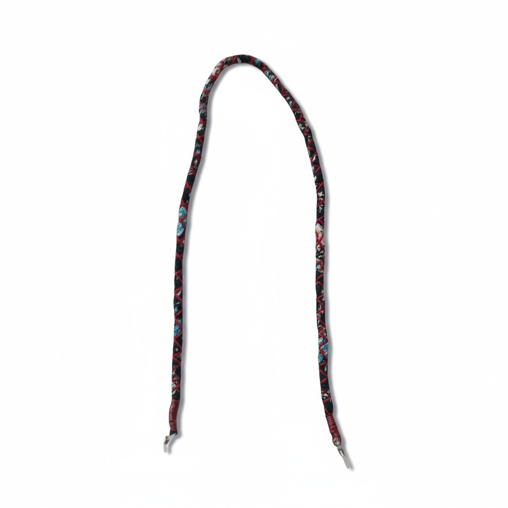 FEDD Jewelry’nin özgün el işçiliğiyle hazırlanan bu gözlük askısı, lacivert zemin üzerine kırmızı ve açık mavi tonlarla işlenen geometrik desenleriyle dikkat çeker. Kumaş iplerle özenle sarılarak hazırlanan bu zarif tasarım, dört mevsim boyunca her stile eşlik eden güçlü bir karaktere sahiptir.