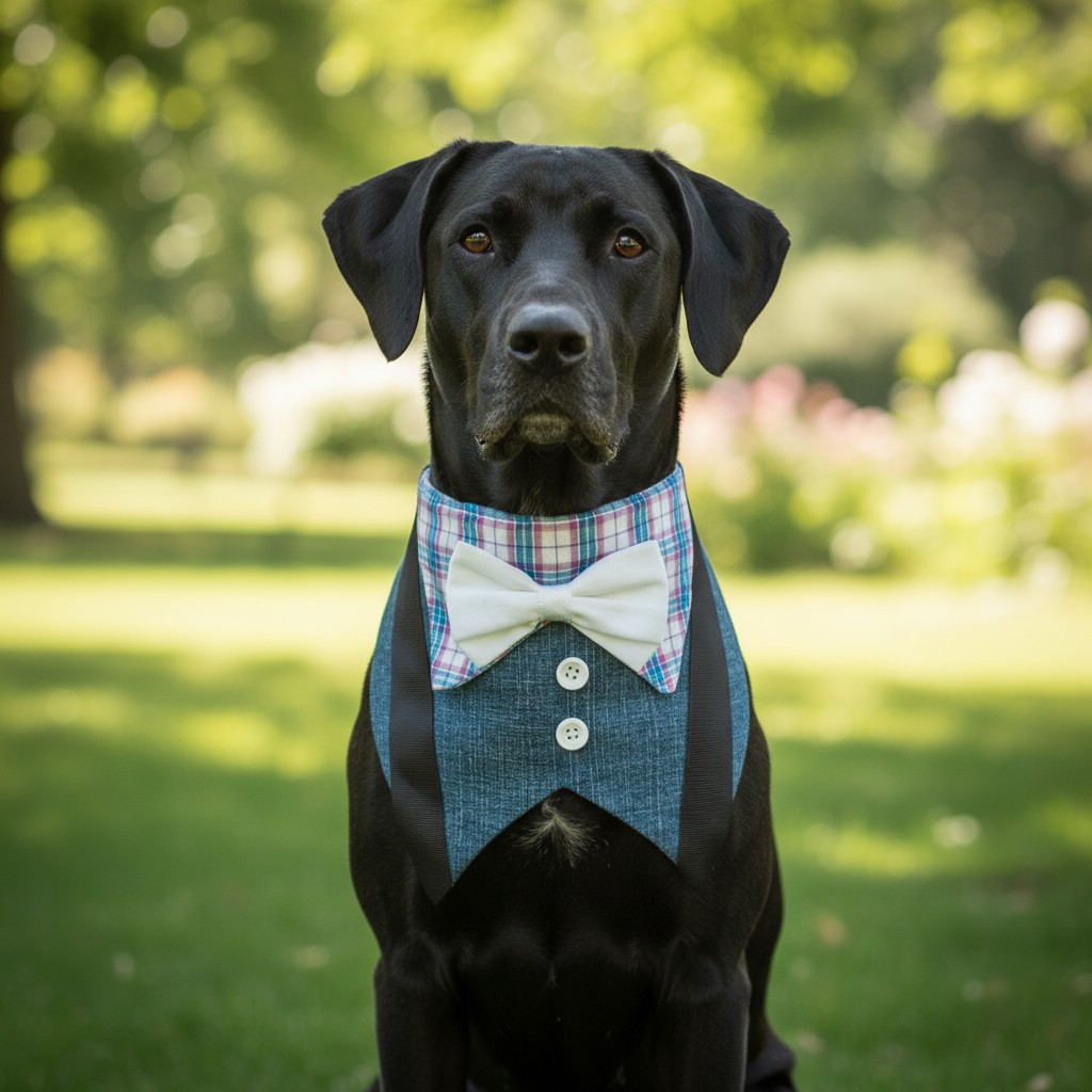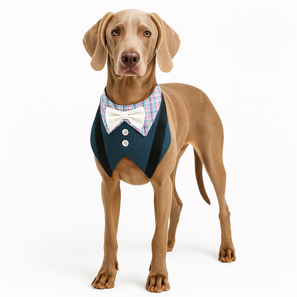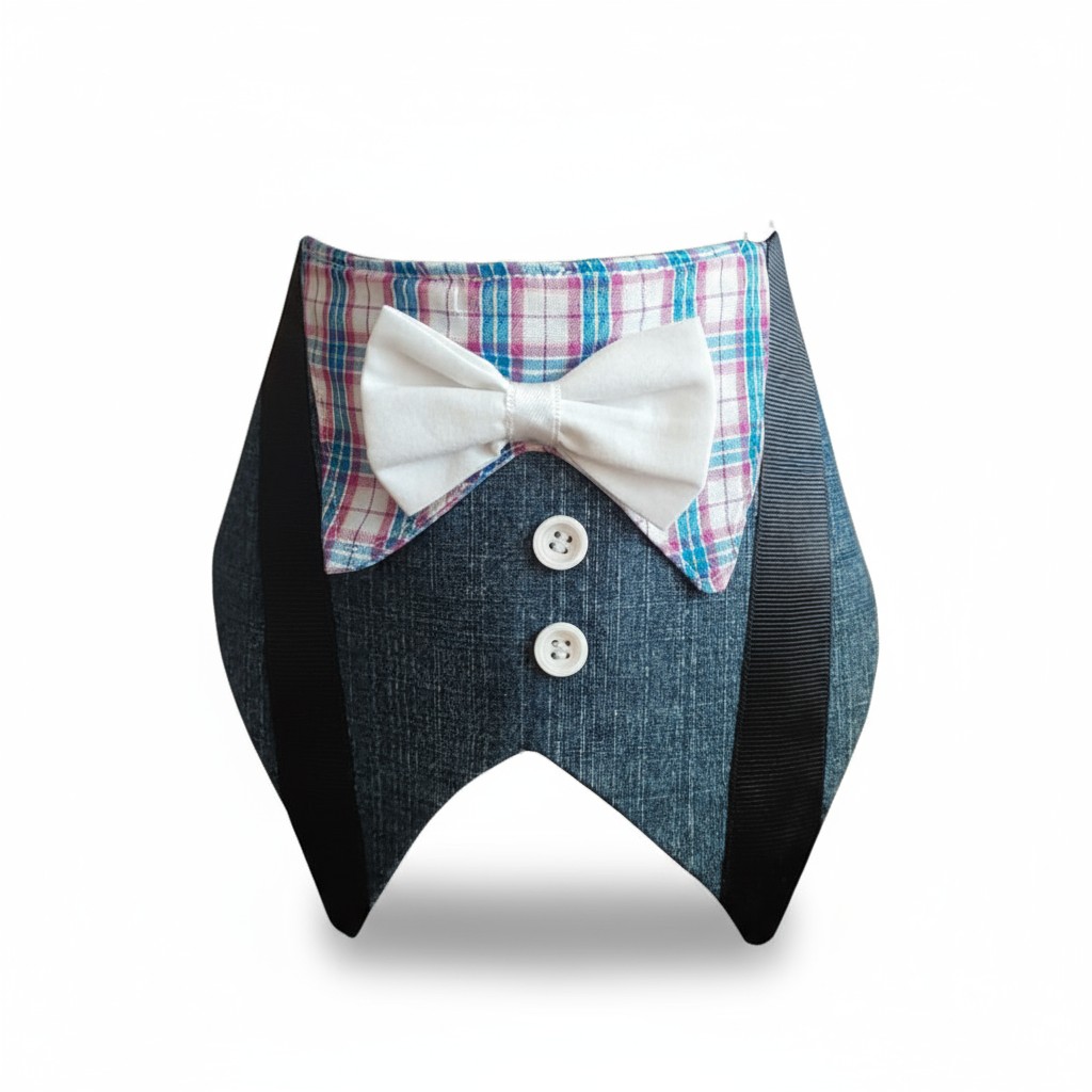 Rahat ama şık tarzıyla dikkat çeken Hafta Sonu Şıklığı, denim dokusu, kareli gömlek yakası ve beyaz papyon detayıyla dostunuzun karakterini yansıtır.