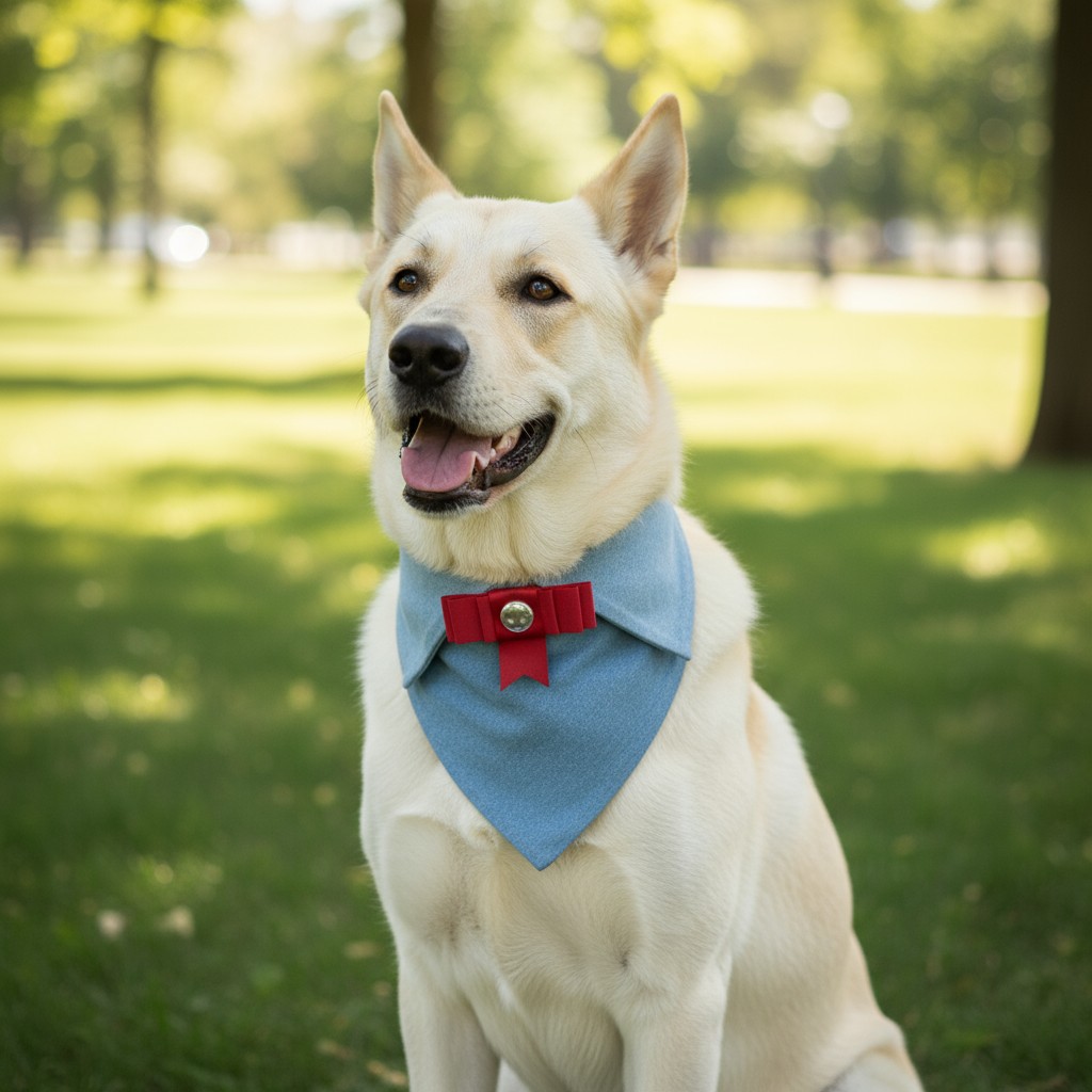 İnci Şıklığı modeli, açık renk denim kumaşın sade dokusunu kırmızı kurdele broş ve inci detayıyla zarif bir stile dönüştürür. El yapımı olarak üretilen bu pet yaka, orta ve büyük ırklar için idealdir. 42–48 cm ayarlanabilir kapama sistemi sayesinde konforlu bir kullanım sunarken, her mevsim şık bir görünüm sağlar.