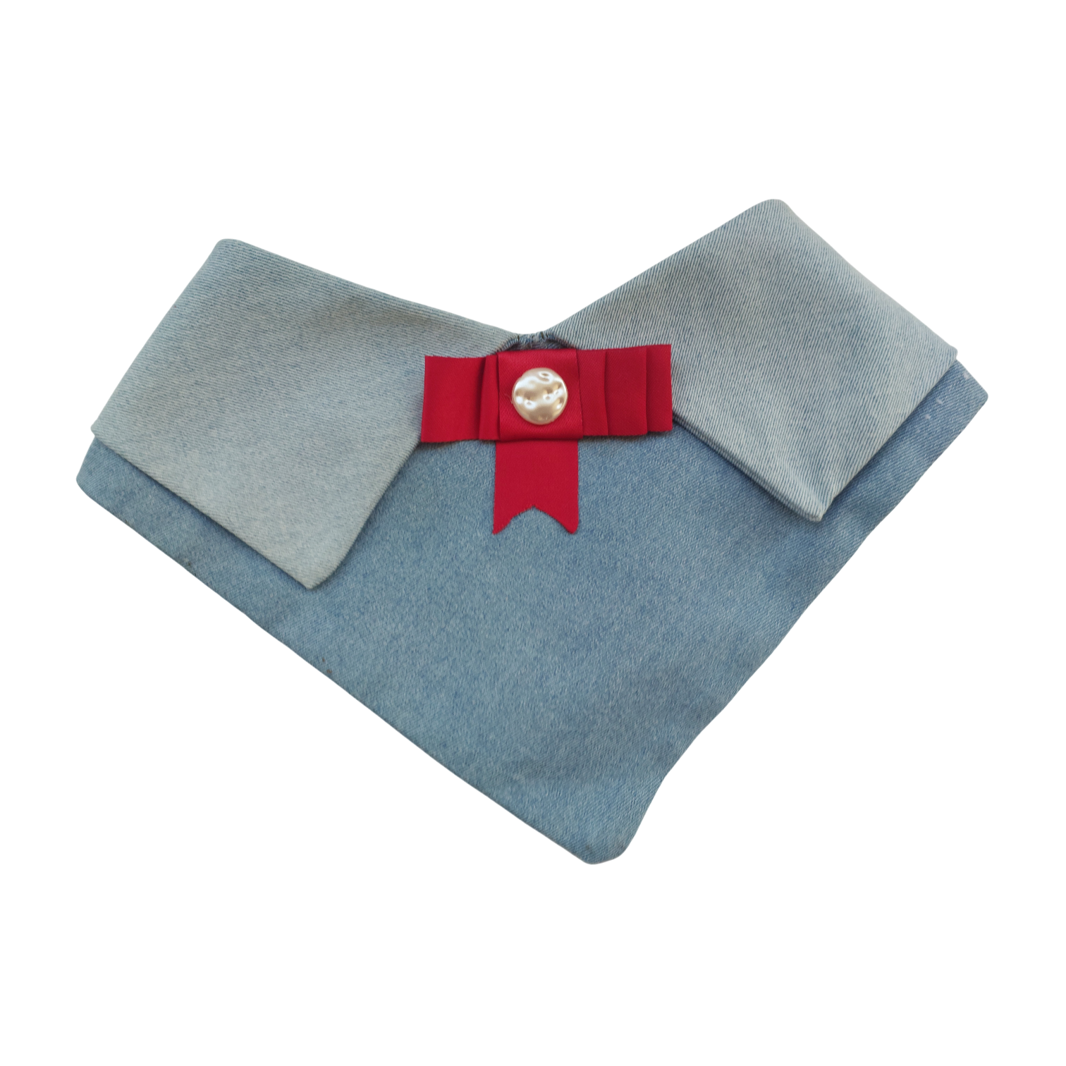 🌍 Handmade denim pet collar with red ribbon and pearl detail for elegant style.