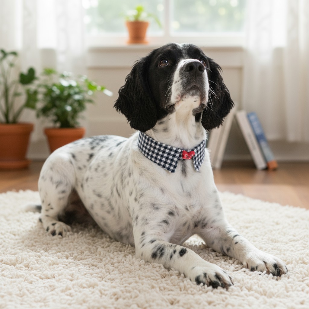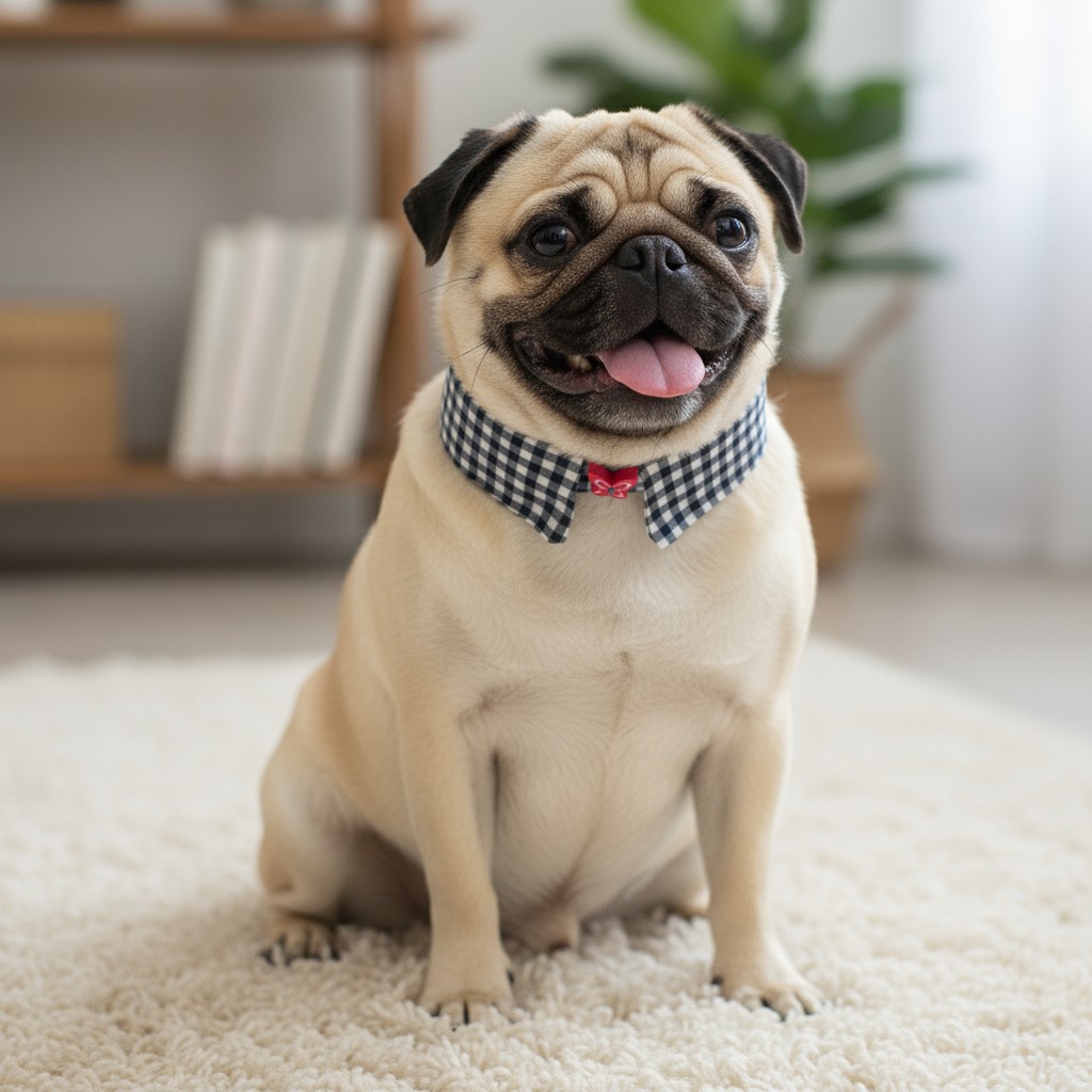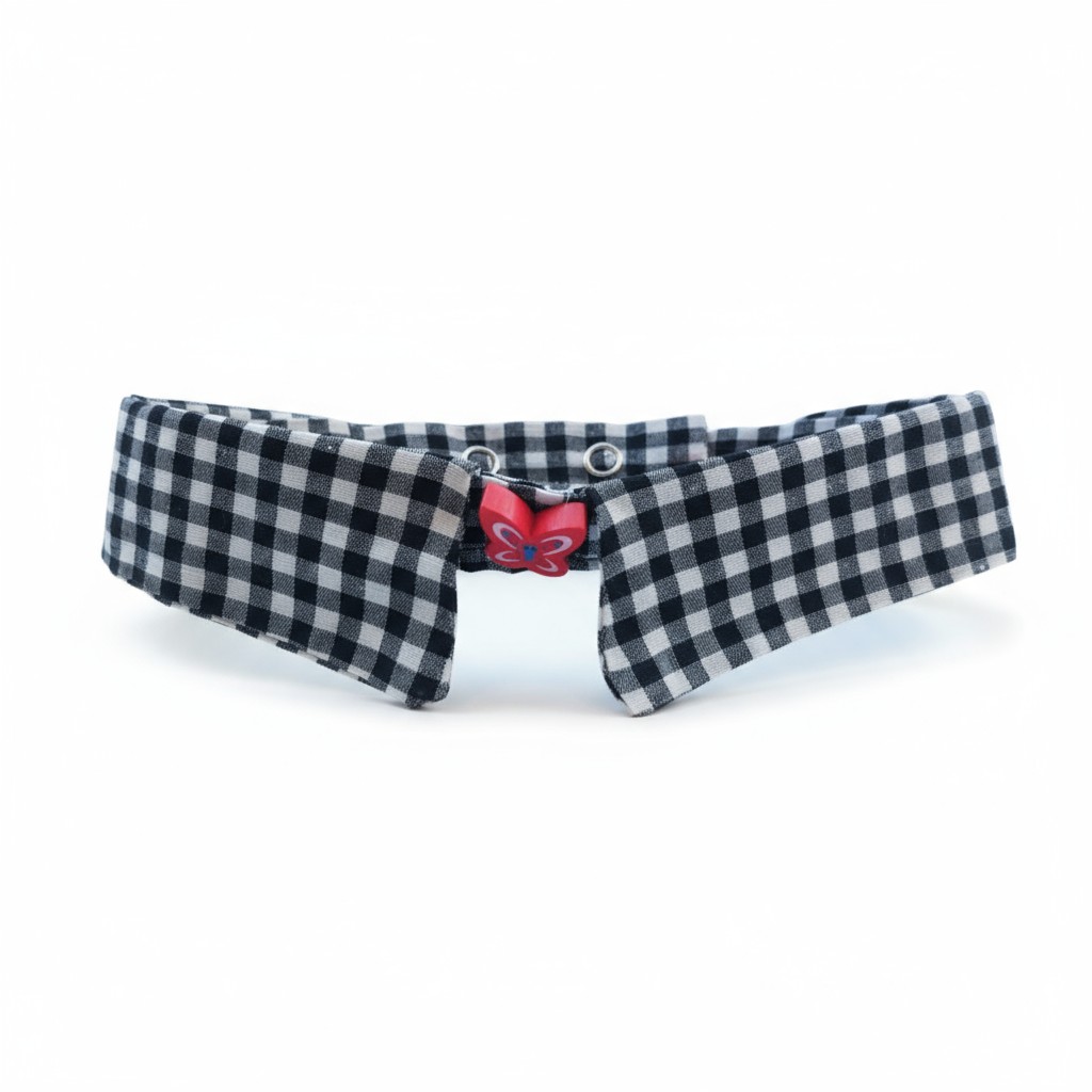 Siyah beyaz kareli deseniyle dikkat çeken bu pamuklu yaka, sade ama etkileyici bir duruş sunar. Kelebek şeklindeki kırmızı süs detayıyla hareket kazanır. Orta ve büyük ırklar için zarif bir seçenektir.