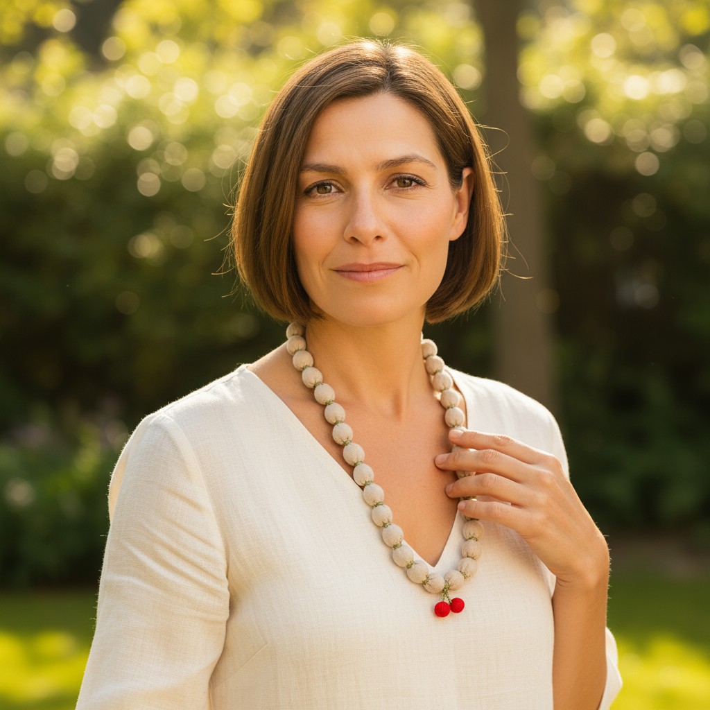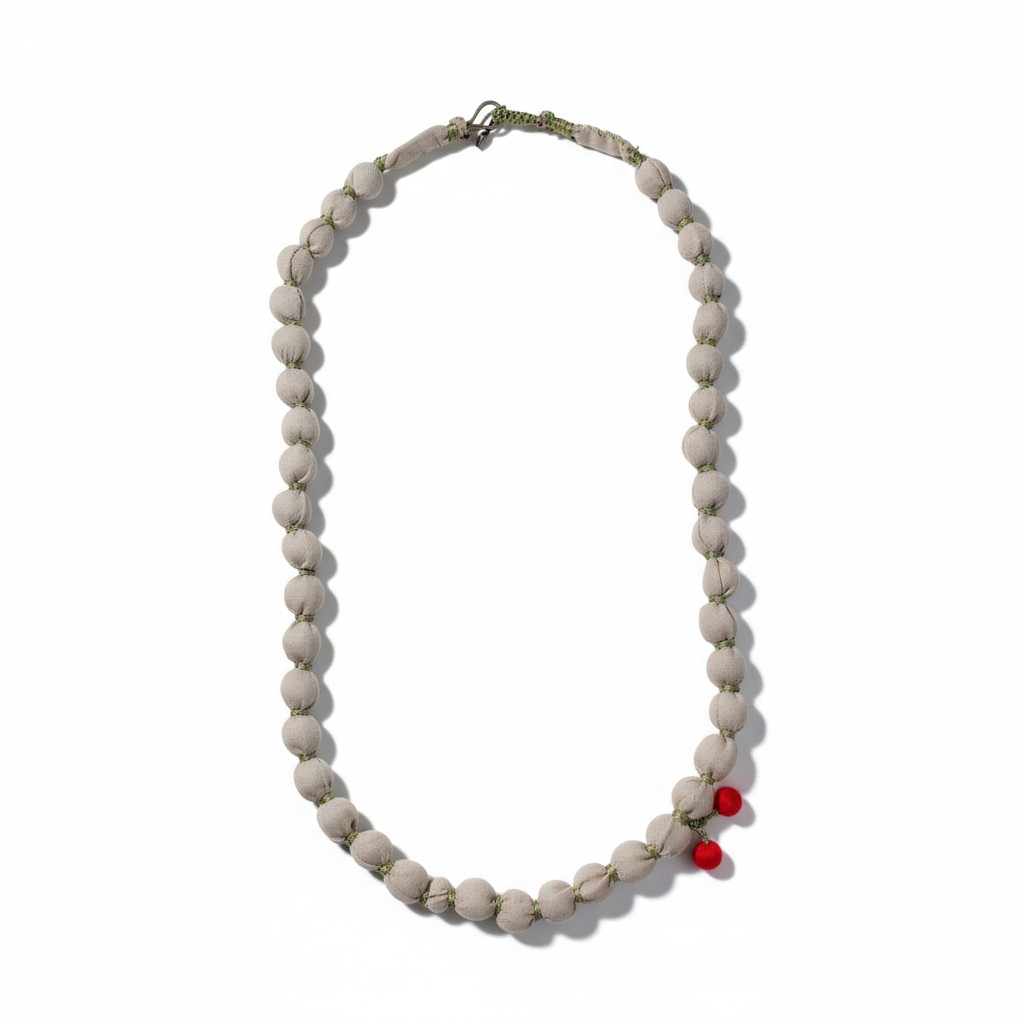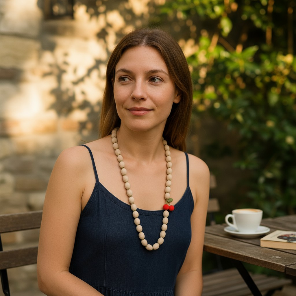 Bu uzun kolye, sade bej kumaş boncuklarıyla zarif bir görünüm sunarken, ucundaki kiraz figürüyle oyunu bozuyor. Tamamı el yapımı olan bu tasarım, çevre dostu malzemelerle üretildi. Stil sahibi ve eğlenceli ruhlara hitap eder.