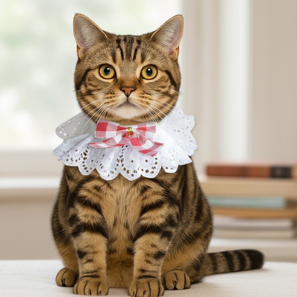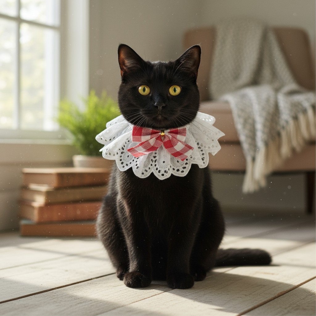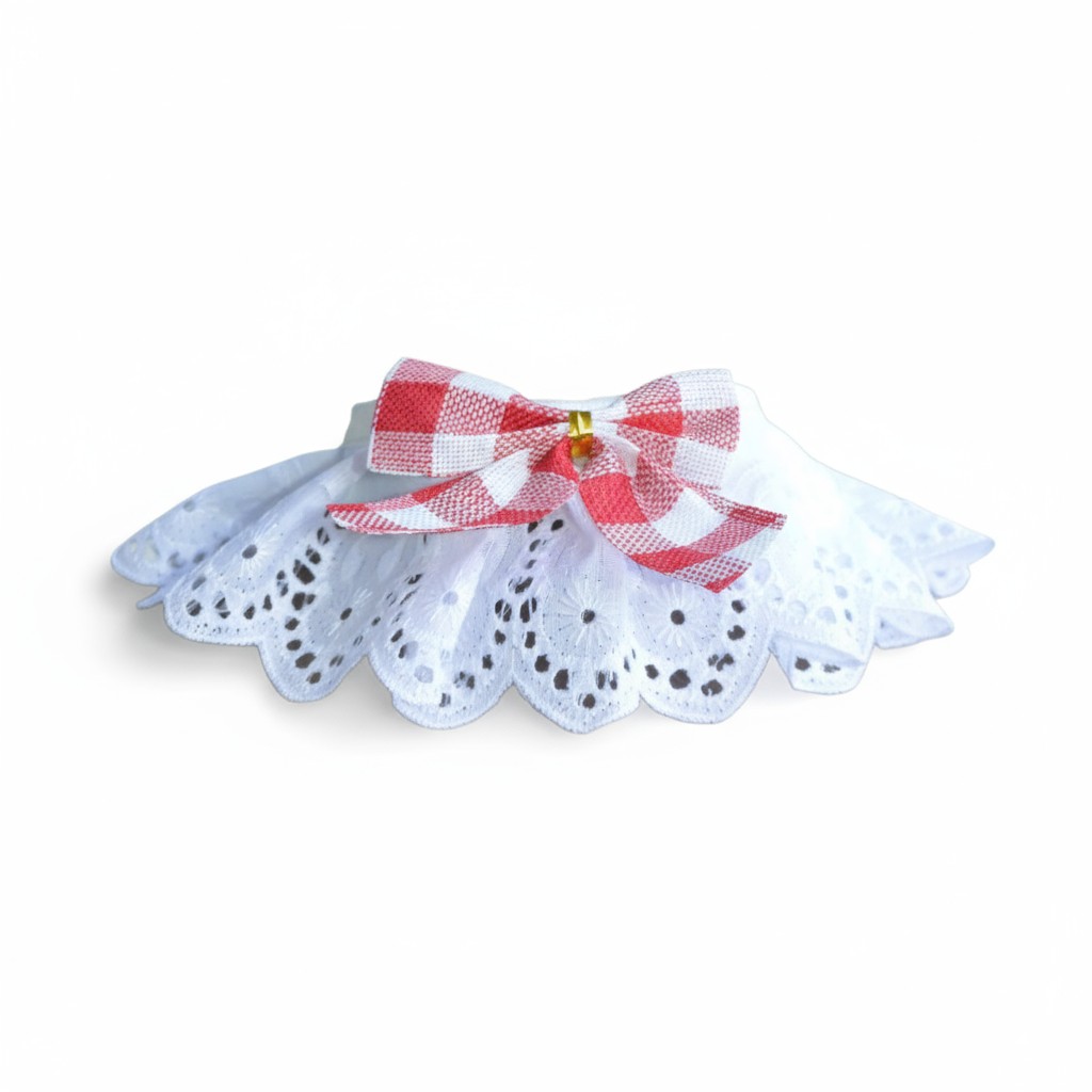 🌍 Handmade lace collar with a red-checked bow — timeless, sweet, and charming for every pet style.