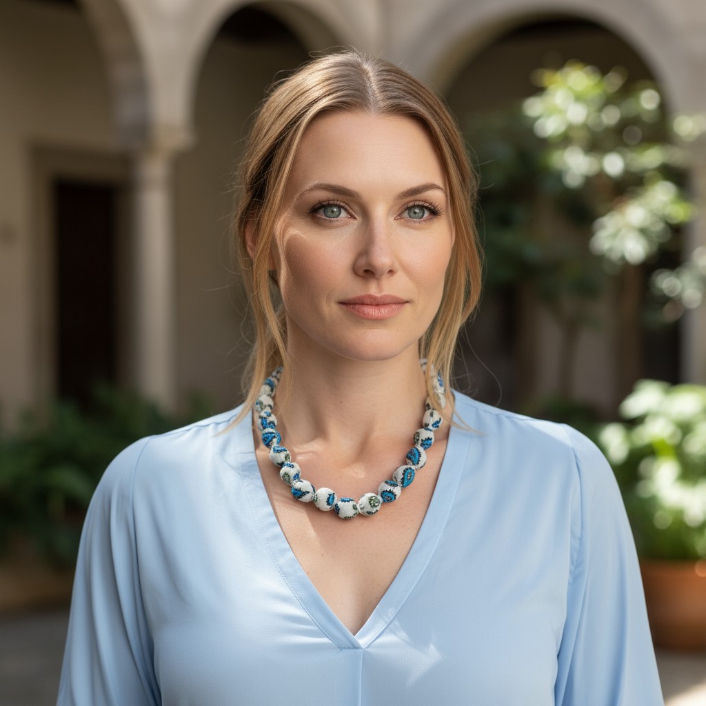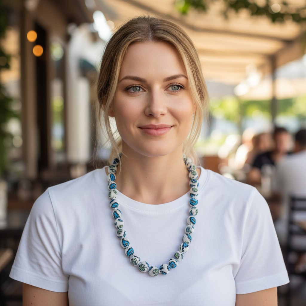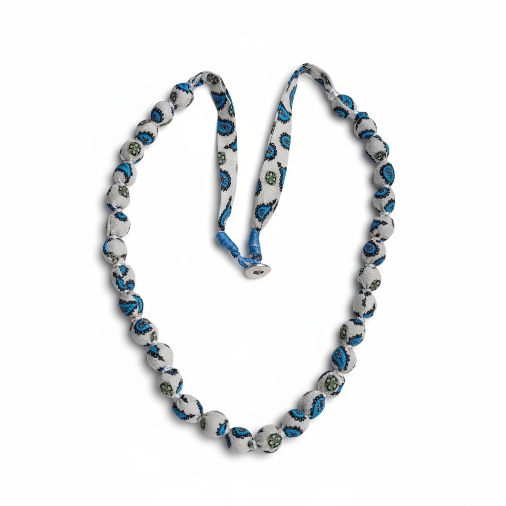 El yapımı bu kolye, mavi ve yeşil şal desenli kumaşın canlı enerjisini zarif beyaz tonlarla buluşturur. Doğal malzemesi ve hafif yapısıyla günlük şıklığa ferah bir dokunuş katar.
