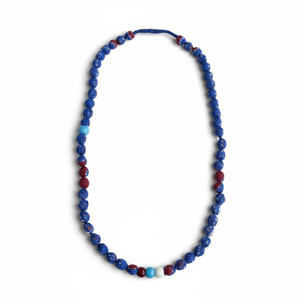 Mavi ve bordo tonların şık uyumuyla tasarlanan bu kolye, el yapımı cam boncuklarla detaylandırıldı. Çevre dostu kumaşlarla hazırlanan kupon bir tasarımdır. Hem klasik hem bohem stillere uyum sağlar.