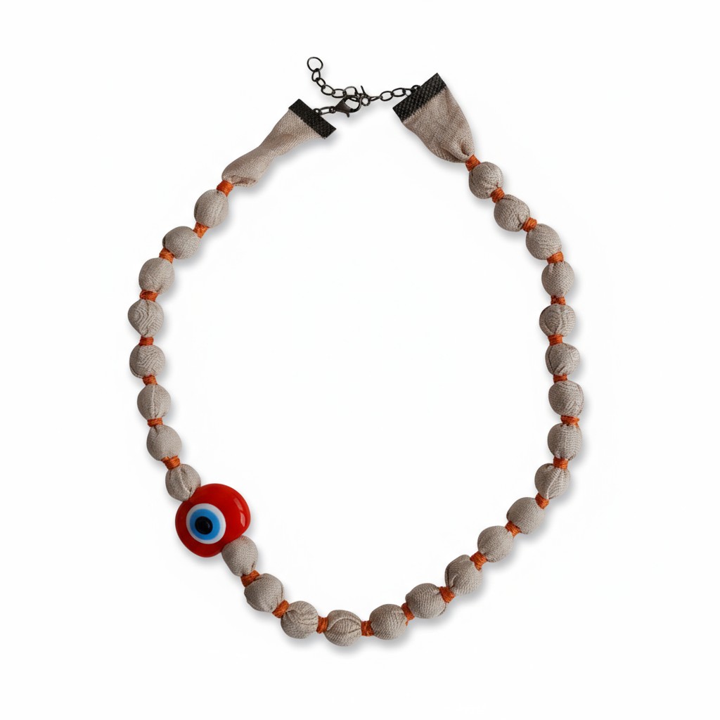 Bej kumaş boncuklarla tasarlanan bu kısa kolye, canlı kırmızı nazar boncuğu detayıyla sade şıklığa güçlü bir anlam katar. El yapımı ve çevre dostu oluşuyla hem stil sahibi hem bilinçli bir tercihtir.