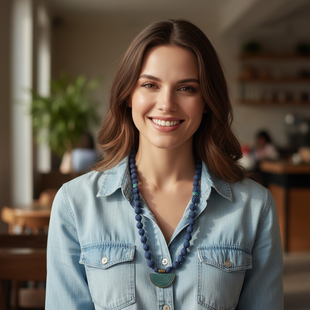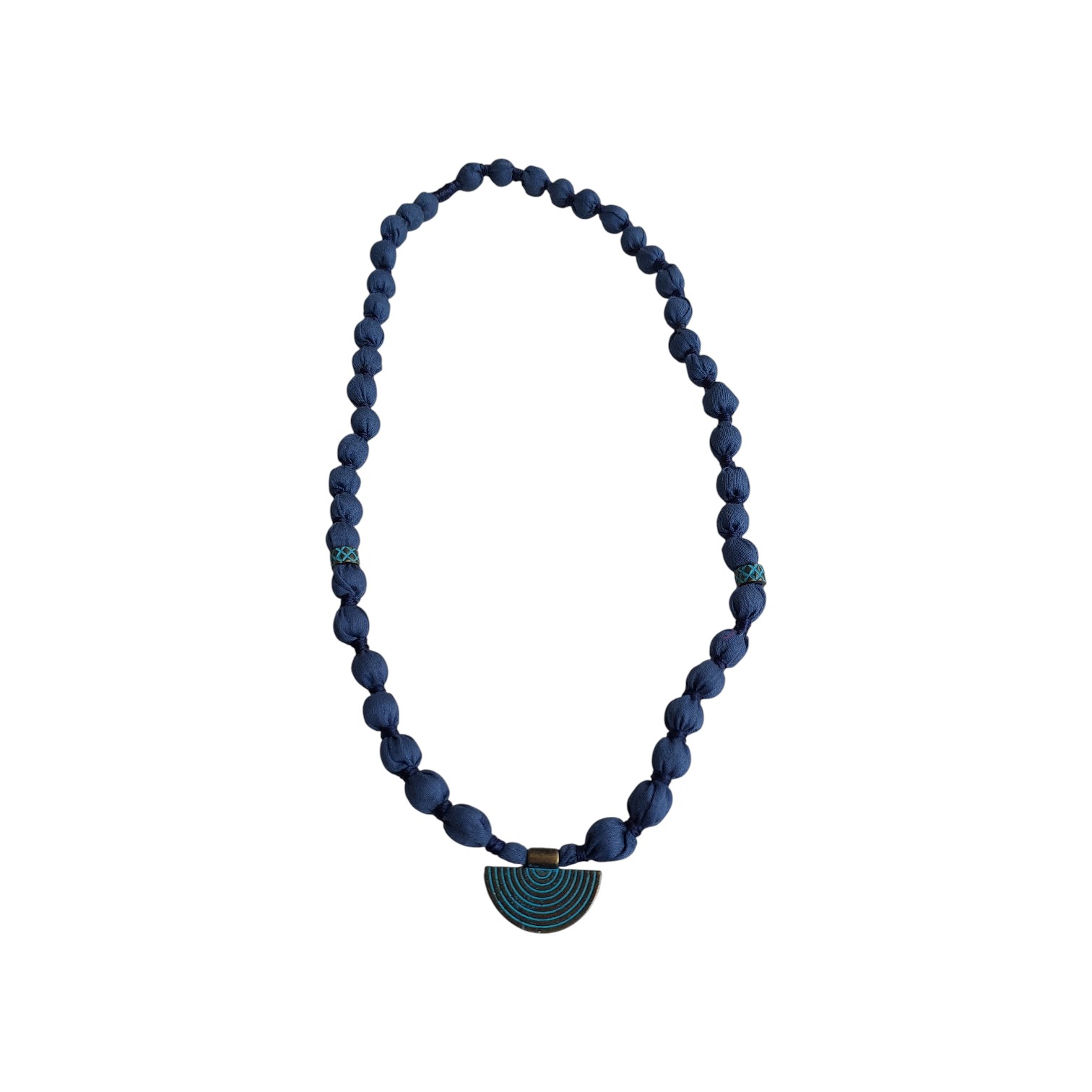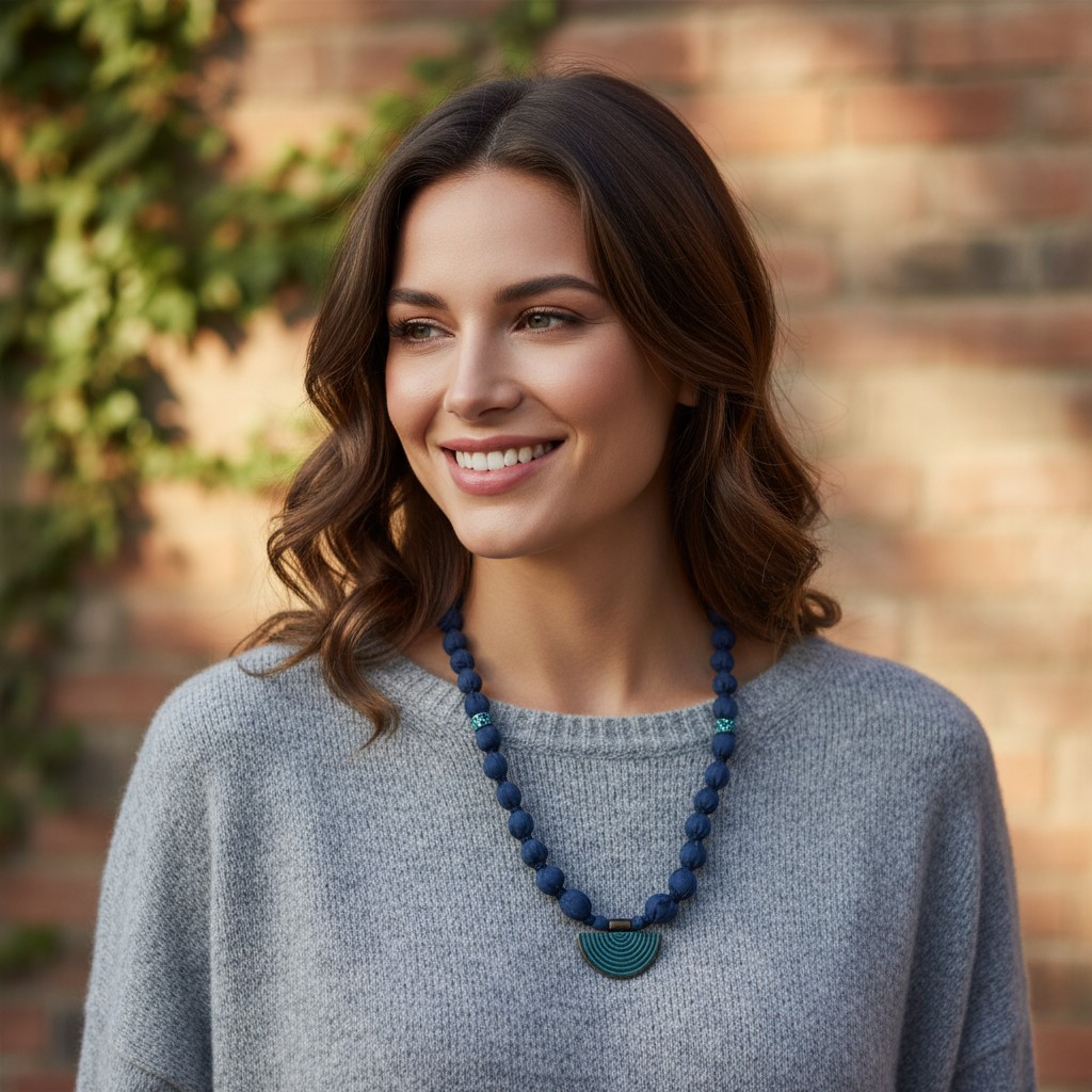 Petrol mavisinin derinliğiyle tasarlanan bu kolye, el yapımı kumaş boncuklar ve dalga formunda uç detayıyla benzersiz bir denge sunar. Hem doğaya duyarlı hem de stil sahibi bir seçimdir.