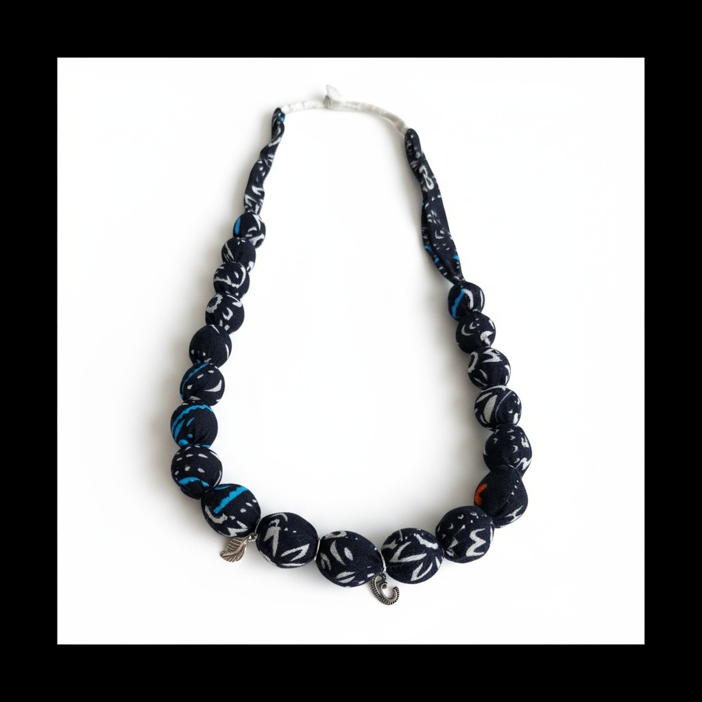 Bu siyah kumaş kolye, zarif beyaz desenleriyle sade ama karakterli bir görünüm sunar. Ucundaki yaprak ve “vav” motifli detay, sadece stil değil anlam da taşır. El yapımıdır, çevre dostu malzemelerle üretilmiştir.