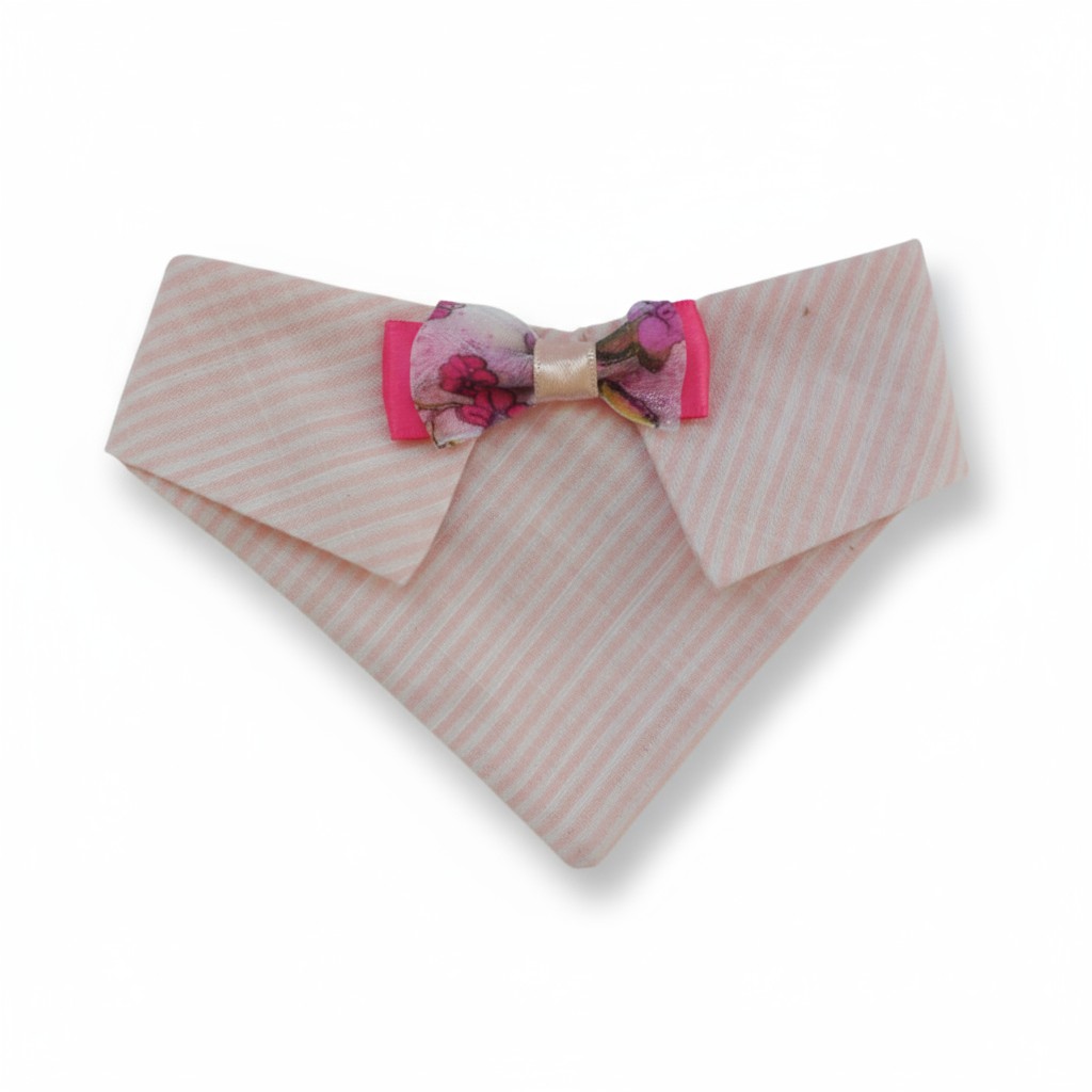 Pamuklu kumaşın yumuşak dokusunu, pembe-beyaz çizgilerin zarif görünümüyle birleştiren bu özel yaka, yavru ve küçük ırklar için tasarlandı. Organze ve saten ikili fiyonk detayıyla, sevimliliği zarafetle buluşturur.