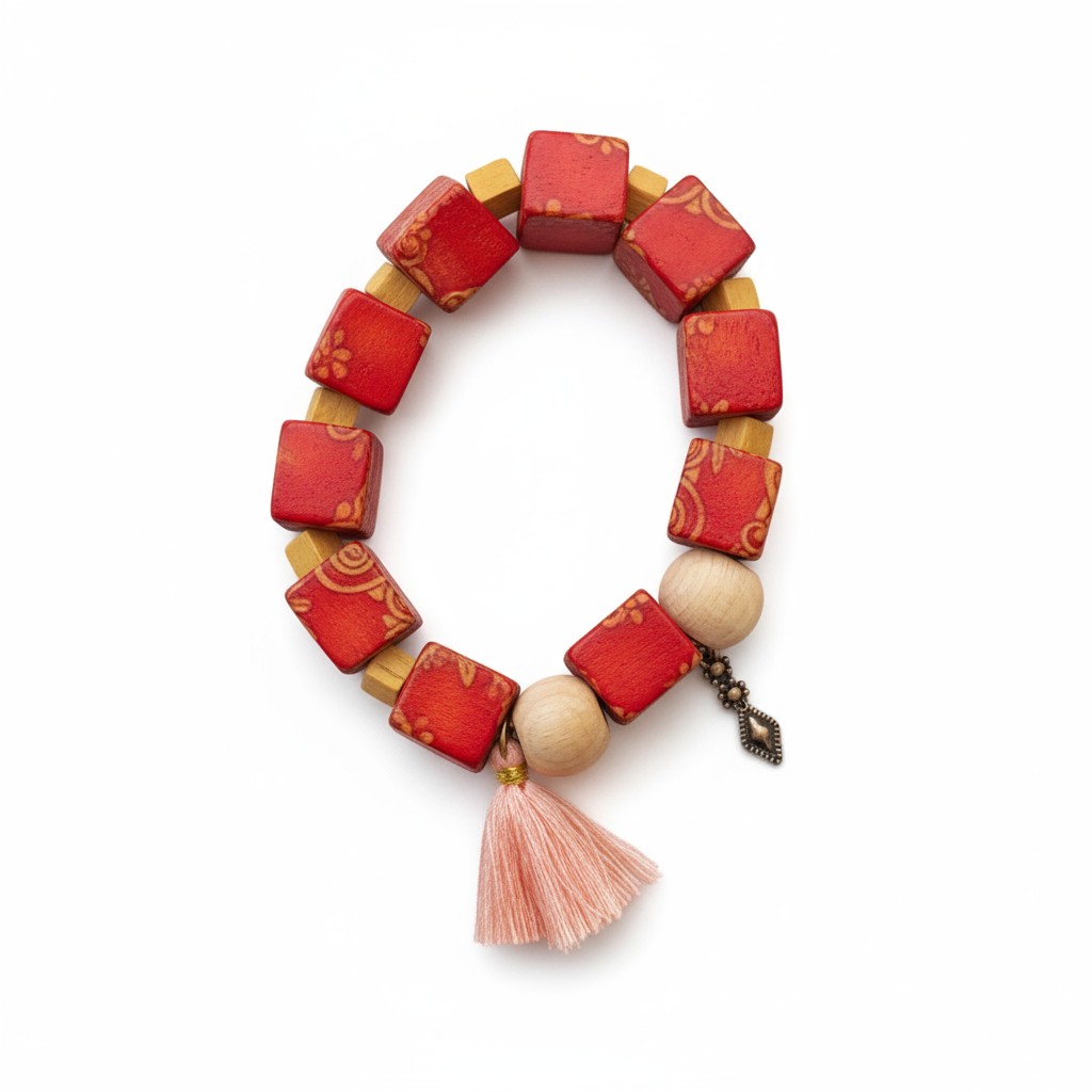 ✨ Malzeme ve Teknik: El boyaması kırmızı desenli ahşap boncuklar ve doğal bitişli ara parçalar.
