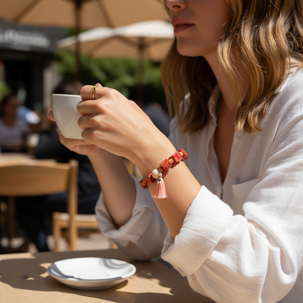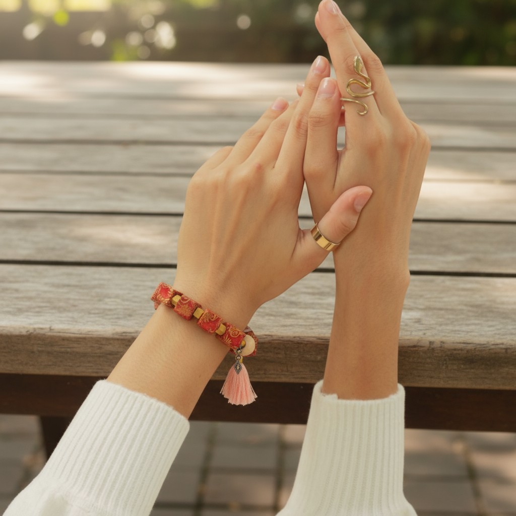 📐 Estetik ve İşlevsel: Tasarımın merkezinde yer alan yumuşak, ipeksi püskül detayı, bilekliğin enerjisini tamamlar.