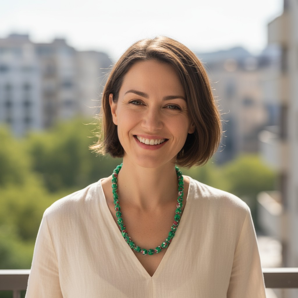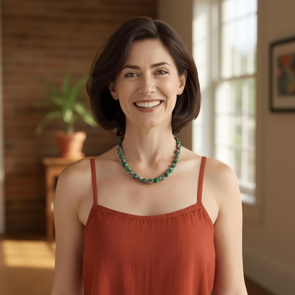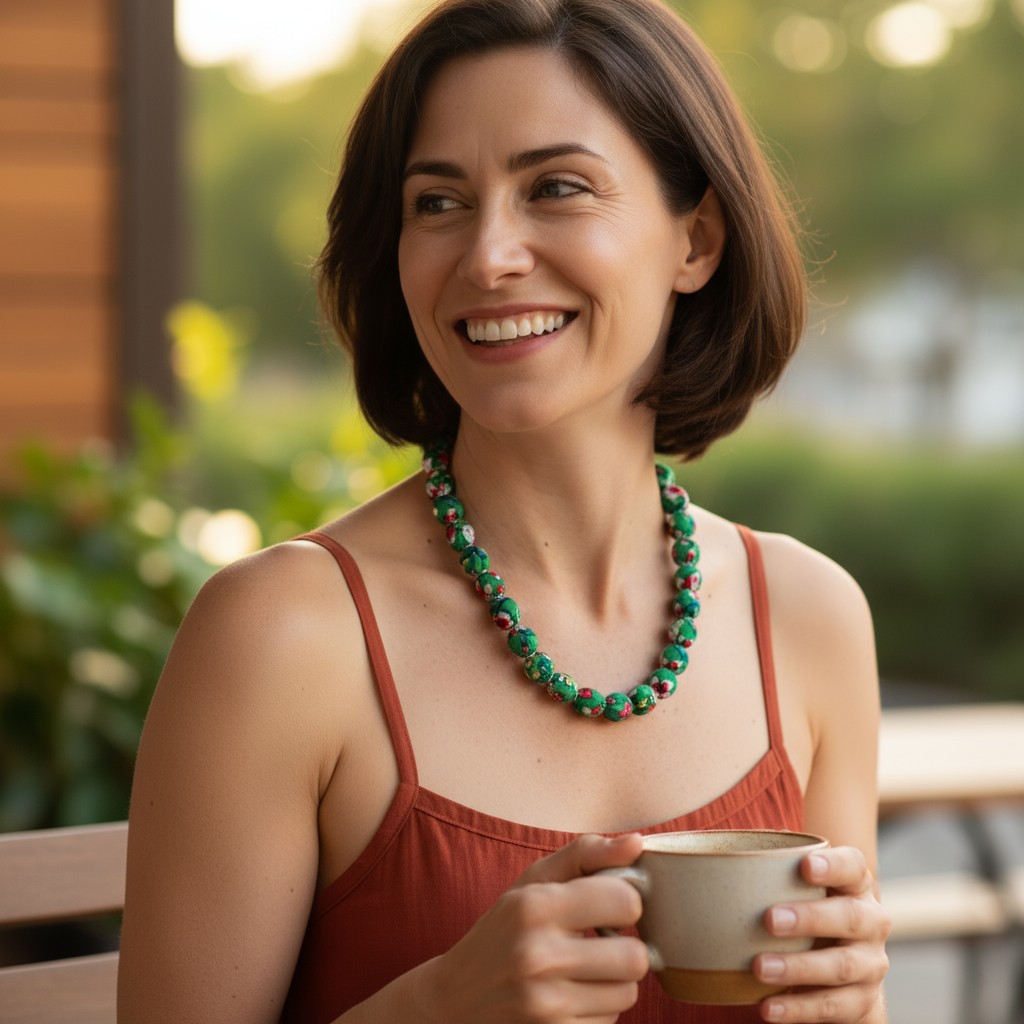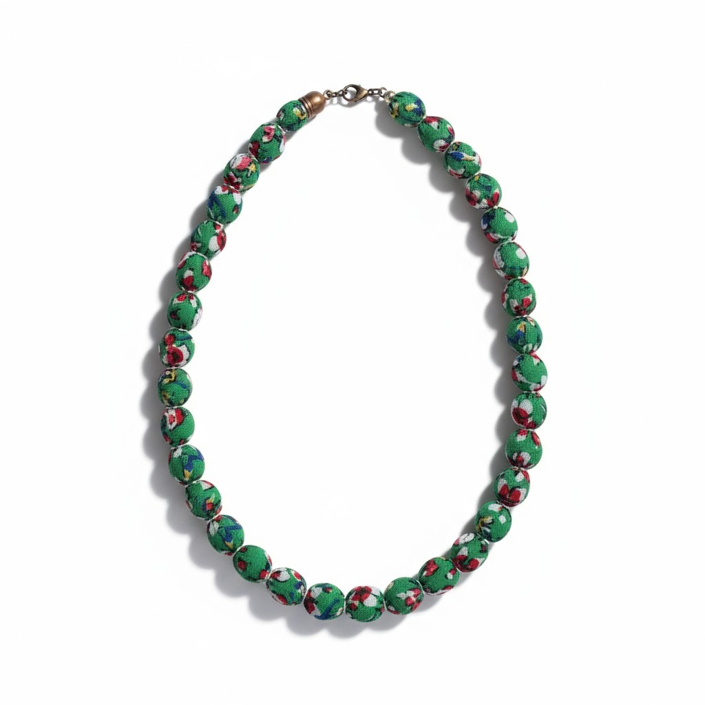 Canlı yeşil tonu ve kırmızı çiçek desenleriyle bu el yapımı kolye, stilinize doğal bir enerji katar. Çevre dostu kumaşlarla üretilmiştir. Günlük şıklık ve özel anlar için ideal.